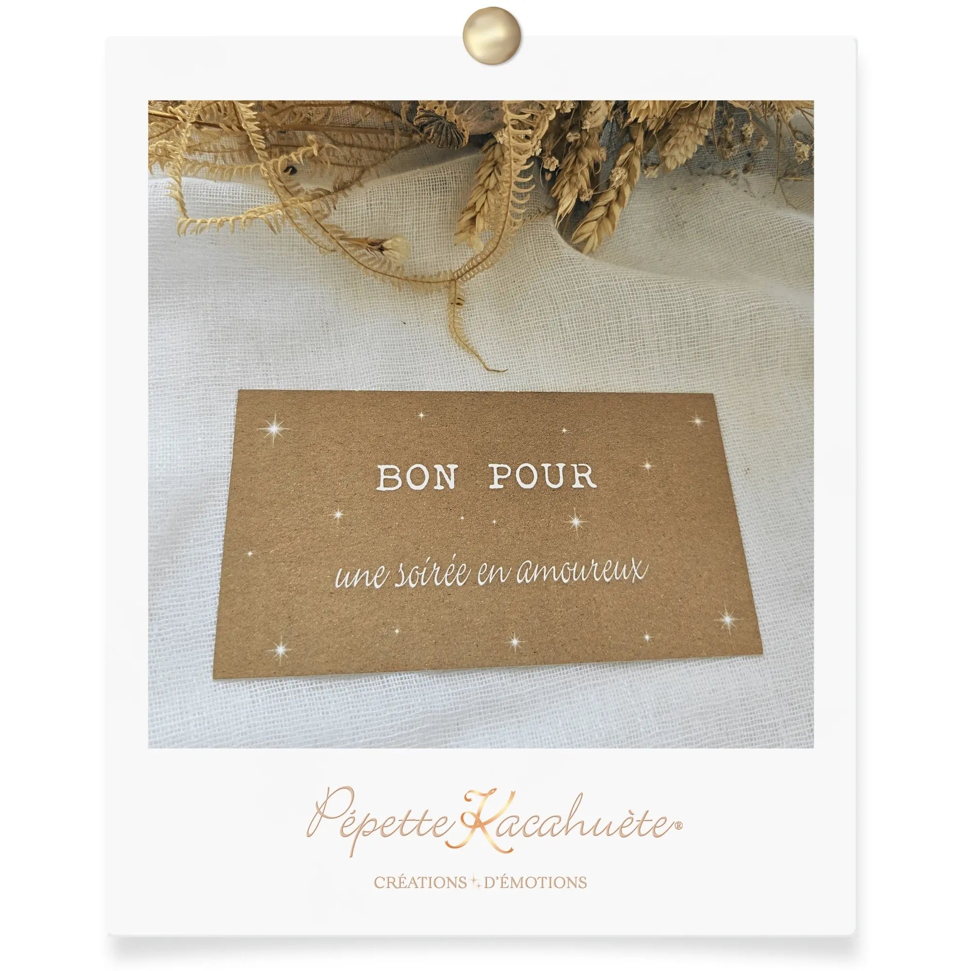 Un bon plein de promesses et de douceur, pour dire 'toi et moi, un soir, juste nous deux. Offrez plus qu'un bon : un instant suspendu, une parenthèse à deux, un doux moment plein d'amour et de tendresse.