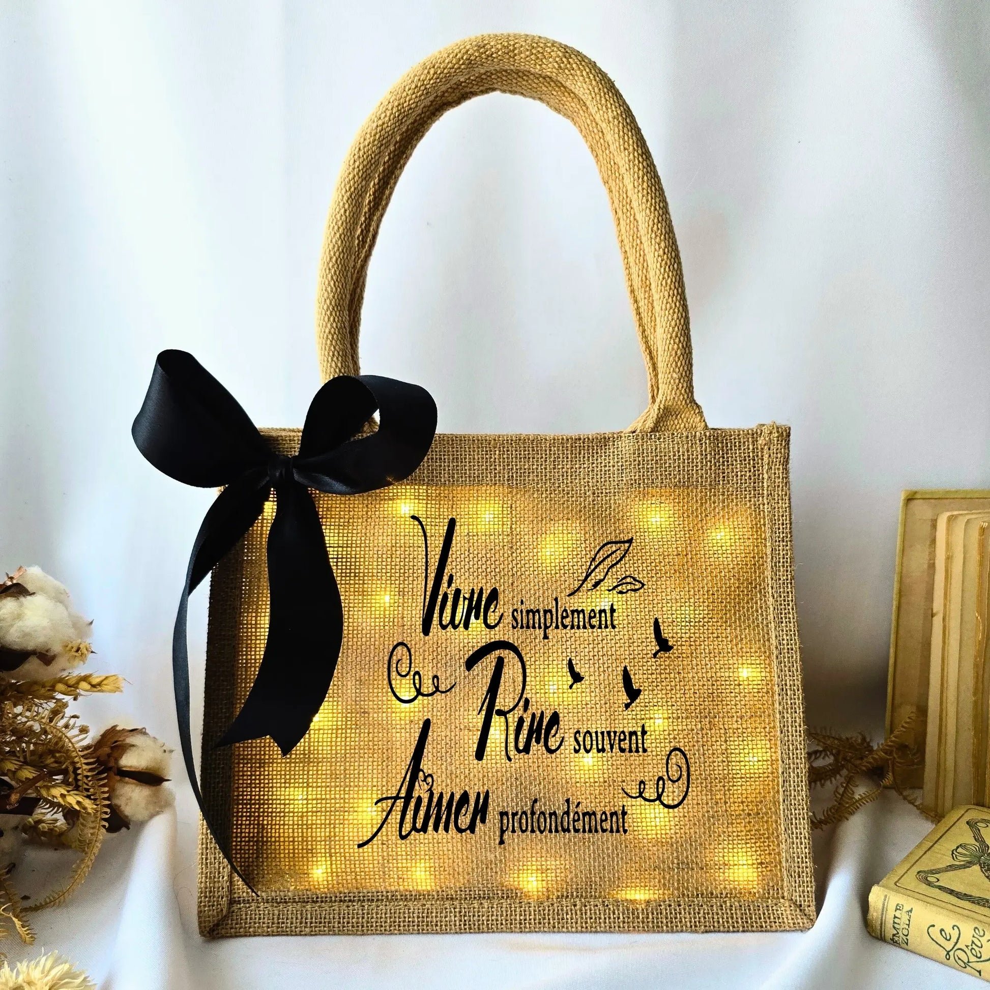 Laissez la douceur et la lumière dans votre intérieur avec le cabas lumineux « Vivre, Rire, Aimer ».